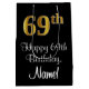 Ce design élégant, sophistiqué et élégant de sac cadeau d'anniversaire comprend un grand numéro ordinal "69e" avec une imitation/faux look or, ainsi que le message de voeux d'anniversaire "Happy 69th Birthday", et un nom de destinataire personnalisable dans une police de style script. L'arrière - plan est noir de couleur. Un luxueux sac-cadeau comme celui-ci pourrait être utilisé pour envelopper les cadeaux donnés à quelqu'un pour célébrer leur 69e anniversaire. [~Z0000514]