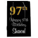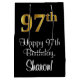Ce giftbag design élégant, luxueux et élégant sur le thème de l'anniversaire comporte un grand numéro ordinal "97th" ayant une apparence fausse/imitation or, en plus du message de voeux d'anniversaire "Happy 97th Birthday", et un nom de destinataire personnalisé dans une police de style script. L'arrière - plan est noir de couleur. Un sac cadeau comme celui-ci peut être utilisé pour donner un cadeau ou un cadeau en l’honneur du 97e anniversaire de quelqu’un. [~Z0000514]