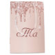 Un sac cadeau pour un mariage glamour. Un fond en faux or rose avec des gouttes élégantes de paillettes roses et or rose, aspect peinture qui coule. Personnalisez avec le monogramme des jeunes mariés écrit en bordeaux avec une police manuscrite moderne