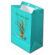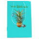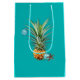 Sac cadeau en papier de taille moyenne à l'ananas de Noël hawaïen. Sacs bleu aqua brillants à ananas unique accrochés à un ornement bleu. Un autre petit ornement et une étoile de mer font partie du design. Ajoutez votre choix de salutation en haut en vert. Exemple de libellé : "Mele Kalikimaka" qui est hawaïen pour "Joyeux Noël". Cette conception fonctionnera pour la plupart des tailles de sacs, mais le texte peut ne pas fonctionner.