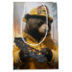 Un ours habillé en pompier tient une carte de la Californie sur une carte dessinée dans une forêt en feu. Le texte peut être modifié.