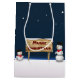 Illustration graphique hivernale montrant deux mignons bonhommes de neige tenant un panneau en bois avec un accueil de Noël dans un environnement enneigé.