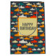 Sac cadeau motif simple mais doux en marine, turquoise, rouge, orange, jaune et gris.