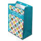 Ce sac cadeau est muni d'un motif de beignets avec glaçage et arrosage de couleur pastel. Le groupe bleu clair sur le dessus dit "ne vous inquiétez pas, soyez heureux !" en police blanche.