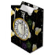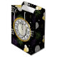 New Year Eve Party Gift Bag Patterned With Balloons, Fireworks and Script On Black Paper With Large Clock Face Center