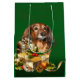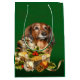 Le teckel rouge aux cheveux longs et légèrement plus âgé se repose fièrement par son sac de cadeau de Noël d'amoureux de les chiens de cadeaux de Noël