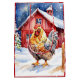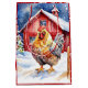 Joli sac cadeau de Noël avec un poulet à l'aquarelle debout près d'une clôture en bois rustique devant une grange. Les côtés sont rouge brique avec des flocons blancs.