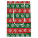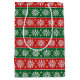Scandinavian-inspired faux-knit pattern of snowflakes, diamonds, and festive stripes in red, green, white, and gold.
