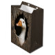 Une oie blanche regarde à travers un trou déchiqueté dans un mur en bois patiné, son bec orange et ses yeux attentifs qui contrastent avec la texture rugueuse du bois. Le texte peut être modifié.