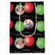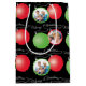 Ce sac cadeau de Noël contient deux ornements traditionnels de Noël ronds, un rouge et un vert dans un motif sur un arrière - plan noir et les mots Joyeux Noël. Six des ornements...trois sur le devant et trois sur le dos... sont des cadres photo personnalisables, vous permettant d'ajouter vos photos de famille préférées.