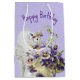 Chat perse blanc et bouquet de pansement violet dans un panier à l'ancienne sur un arrière - plan pois de polka pour un anniversaire. Le texte peut être modifié ou supprimé.
