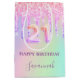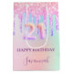 Elégant, classique, glamour et féminin pour une fête de 21e anniversaire. Un arc-en-ciel, arrière - plan holographique unicorne en rose, violet, or rose et vert menthe. Décoré avec des gouttes de parties scintillant, la peinture goutte à goutte. Personnalisez et ajoutez un nom. Avec le texte : Joyeux anniversaire. Le nom est écrit avec un script de style moderne écrit à la main. Le numéro 21 est écrit avec une police de style ballon.