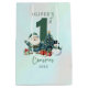 Illustration d’aquarelle de charme célébrant le tout premier Noël d’un bébé. Un "1er" vert audacieux prend le devant de la scène avec "Noël" élégamment scénarisé en dessous. Un délicieux Père Noël et un bonhomme de neige aux tons verts accompagnent un sapin de Noël festif et des cadeaux joyeux, créant une scène de vacances charmante et fantasque. Un art cosy et attachant qui respire l'esprit de Noël.