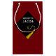 Sac cadeau de remise des diplômes créatif avec un design de casquette noir et or sur fond bordeaux. Pour personnaliser, modifiez le texte pour ajouter le nom du diplômé.