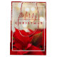 Un sac cadeau avec une photo festive de vacances avec un bouquet de poinsettias rouges sur le fond. Des lumières dorées chatoyantes dans l'arrière - plan. Style élégant et élégant. Jolie typographie de Noël écrite dans une police rouge tendance. L'arrière - plan a des flocons d'or sur le rouge foncé.