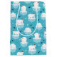 Playful polar bears in Santa hats float on icy blue seas surrounded by igloos, fish, and snowflakes. A cool Christmas favorite.