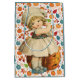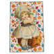 Sac cadeau d'Halloween avec une petite fille en robe désuète, en sculptant une pomme et en jetant le poil sur son épaule. Le tout sur un arrière - plan coloré de citrouille et de feuille en rouge, marron, orange et bleu. C'était un jeu joué par les enfants. Le poil de pomme devait tomber en indiquant les initiales ou le nom de leur futur fiancé.