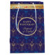 Première bougie d'Hanoukka. Happy Hanoukka Festival de lumières fête cadeau Sac cadeau beauté Juive carte de vacances. Beau arrière - plan de Noël juif Chanoukah avec les symboles décoratifs traditionnels Chanoukah - dreidels en bois (dessus filant), beignets, hanukkiah menorah, bougies, étoile de David et lumières brillantes papier peint or hanukkiah bleu marine motif motif. Hanoukka festival de lumières décoration d'événement. Jérusalem, Israël. Articles d'artisanat et de fête > Articles d'enveloppement de cadeaux > Sacs cadeaux avec modèle texte. Personnalisez-les en ajoutant un nom ou un texte de voeux. Design à deux côtés. Personnaliser
