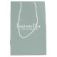 Sac cadeau de proposition Bridesmaid moderne avec nom de femme d'honneur personnalisée en blanc style de police de script moderne avec texte en style de police sans serif moderne sur arrière - plan vert sage. Aussi parfait pour femme de ménage d'honneur, fille de fleurs et plus.