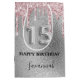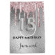 Elégant, classique, glamour et girly pour une Quinceañera, 15ème anniversaire. Un arrière - plan métallique en faux argent. Décoré avec des gouttes de parties scintillant rose vif, l'aspect de la peinture goutte à goutte. Personnalisez et ajoutez un nom. Avec le texte : Joyeux anniversaire. Le nom est écrit avec un script de style moderne écrit à la main. Le numéro 15 est écrit avec une police de style ballon.