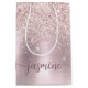 Sac cadeau personnalisé à paillettes métallisées rose doré avec monogramme, nom ou signature en écriture manuscrite. Ce design présente votre prénom dans une jolie écriture manuscrite avec une typographie à queue de style signature (ou calligraphie) sur un fond rose doré métallisé avec une bordure scintillante et glamour. Ceux-ci sont faciles à personnaliser. Ce sac cadeau féminin est idéal pour un cadeau de pendaison de crémaillère, ainsi que pour un anniversaire, la fête des mères, un mariage, un anniversaire de 16 ans, une fête prénatale, une baby shower, un cadeau de remise de diplôme et c'est pour la fille qui aime les choses uniques et élégantes scintillantes.
