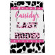 Ces sacs-cadeaux personnalisés sont parfaits pour les cadeaux et les faveurs de fête pour votre soirée disco cowgirl bachelorette. Ils ont un amusant motif en peau de vache noire et blanche avec les mots DERNIER RODEO en lettres à motifs de vache et le nom de la mariée ci-dessus en lettres de script rose.