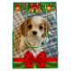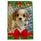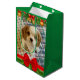 C'est un sac-cadeau de vacances de taille moyenne et festif avec une photo originale d'un adorable petit chiot d'épices Blenheim Cavalier King Charles assis sur sa couverture préférée.