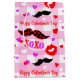 Mignonne Saint Valentin, sac cadeau personnalisable avec moustaches, lèvres rouges, coeurs, câlins et baisers et un message Heureuse Sainte-Valentin sur un motif rose en vichy. Ajoutez du papier de tissu coordonné pour envelopper rapidement un cadeau pour votre amoureux!