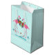 Flamants roses sac cadeau en papier de Noël. De taille moyenne, couleur bleu clair avec deux flamants roses et étoiles de mer de part et d'autre. Libellé "Mer & Salut" en rose sous les flamants roses qui portent des couronnes festives de fleurs saintes et d'hibiscus.