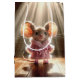 Une mignonne souris est posée sur un sol en bois, portant une robe rose et des chaussons éclairés par des rayons de soleil pour l'anniversaire. Le texte peut être modifié.