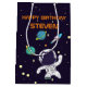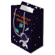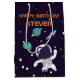 Sac cadeau d'anniversaire avec un arrière - plan bleu foncé aux étoiles jaunes éparpillé autour. Couché sur le dessus est l'illustration d'un astronaute vêtu d'une combinaison blanche flottant dans l'espace. Au loin, il y a des planètes avec des anneaux et un vaisseau-fusée qui explose vers des endroits inconnus.