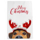 Illustration d'un animal de Noël mignon avec un chien curieux portant un bandeau de rennes. Salutation saisonnière écrite en lettres de typographie moderne.