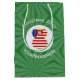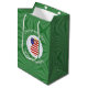 Le sac cadeau moyen comporte un ange roux portant le drapeau des Etats-Unis d'Amérique pour la décoration de cadeaux de vacances ou de Noël. L'ange de Noël du drapeau américain se trouve à l'intérieur d'une fractale circulaire blanche de carrés grossiers. L'arrière - plan est une fractale verte de carrés grossiers. Ajoutez votre propre texte ou personnalisez avec un nom et l'année.