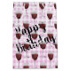 Verres de vin rouge avec heureux texte d'anniversaire sur rose et blanc en vichy arrière - plan. Le texte peut être modifié ou supprimé.