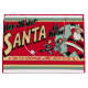 Le design est issu d'une publicité de Noël rétro. Le texte indique "Hé les enfants ! Le Père Noël est ici dans notre rayon de jouets tous les jours de midi à 17h." tandis qu'un petit garçon et une petite fille courent pour saluer un Père Noël qui agite la main.