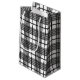 Un sac cadeau modifiable pour petite entreprise ou fête avec écriture et lettres décoratives sur un carré encadré de rouge sur un motif à carreaux horizontal noir et blanc inspiré de Glen avec de fines rayures.