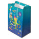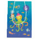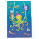 Bleu, Turquoise et une pieuvre verte aux poissons colorés tient un gâteau à trois couches sur son tentacule.Customisez l'âge sur ce sac cadeau pour l'anniversaire de votre oursin préféré.