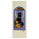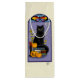 Un chat noir assis sur un tas de livres à la bougie rouge, des citrouilles, des susans aux yeux noirs et un papillon en verre taché sur un fond de violet et de jaune clair.