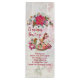 Un sac cadeau de Noël festif. L'arrière - plan est un collage de style vintage avec une image défraîchie de roses roses, de feuilles verts et d'écriture française. Au-dessus se trouve un joli bouquet de noël poinsettia et un cheval victorien à bascule entouré de jolis pivoines roses.
