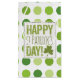 Le vert a pointillé points de caractéristiques de sac de cadeau de conception de grands de divers vert de couleur sur un arrière - plan blanc avec une bannière de blanc avec le texte vert et un shamrock qui lit le jour de St Patrick heureux sur l'avant et le dos !