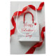 Un sac-cadeau blanc est posé au centre sur un fond clair, son ruban rouge vibrant coulant gracieusement autour de lui, ajoutant une touche d'élégance.
