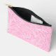 Sac cosmétique rose clair avec dessin au pochoir blanc.