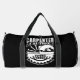 This bold black duffle bag features a warning for anyone around a working carpenter: "CARPENTER CAUTION FLYING TOOLS AND OFFENSIVE LANGUAGE LIKELY." The design showcases woodworking tools like a saw and hand plane, making it a perfect humorous gift for any skilled tradesperson. Edit color of the bag caps and body in the Design tool to your favored colors.