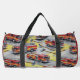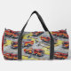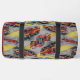 A gray duffle bag is covered in a vibrant pattern of red fire trucks, complete with ladders and fire axes, set against a light-colored ground with yellow splashes. A prominent side pocket, adorned with a red fire department emblem, proudly displays "FIRE RESCUE," "JENNY SAMSMITH," "FIRE DEPARTMENT," and "Vancouver B.C.," creating a personalized and functional item for a firefighter. Personalize with your name and department home town and more. monogram