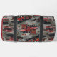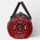 This duffle bag boasts a dynamic pattern featuring an array of red fire trucks with yellow stripes, alongside scattered fire axes. The realistic illustrations are set against a muted background that combines shades of gray and hints of yellow, creating an immersive scene. This design is perfect for those who admire the brave work of firefighters and emergency services. A prominent side pocket, adorned with a red fire department emblem, proudly displays "FIRE RESCUE," "JENNY SAMSMITH," "FIRE DEPARTMENT," and "Vancouver B.C.," creating a personalized and functional item for a firefighter. Personalize with your name and department home town and more. monogram