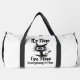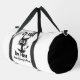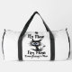 This white duffle bag features a humorous design of a distressed, wide-eyed black cat with blue eyes, and the text "It's Fine," "I'm Fine," and "Everything Is Fine" in a messy, scrawled font. This relatable design is perfect for those who maintain a positive façade despite chaos. Edit color of the bag caps and body in the Design tool to your favored colors..