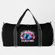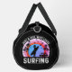 C'est la vague pour toutes les filles qui aiment l'océan ! Ce design vibrant présente le texte 'Juste une fille qui aime le surf' en caractères blancs gras, avec le mot 'surf' écrit dans un style manuscrit ludique. La silhouette d'une femme tenant une planche de surf marche le long de la plage, sur un magnifique fond multicolore rétro. Complète avec des silhouettes d'oiseaux, de palmiers et d'un van de surf vintage surmonté de planches, cette conception est parfaite pour les amoureux de l'océan, les amateurs de surf et tous ceux qui vivent pour les journées à la plage et les bonnes vibrations !