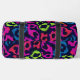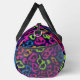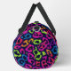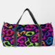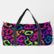 This image showcases a duffel bag featuring a dynamic and playful leopard print pattern. The spots are rendered in vivid neon colors, including bright pink, electric blue, lime green, and vibrant orange, set against a dark, possibly navy or black, background. The texture of the spots appears somewhat textured or distressed, adding to its edgy appeal. Black straps are visible, completing the practical design. This bag makes a bold fashion statement, perfect for adding a pop of color to any outfit or gym routine.