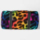 This image displays a duffel bag featuring a captivating leopard print design where the spots appear to be outlined with a vibrant, glowing rainbow effect. The "fur" within the spots transitions smoothly through a spectrum of colors including blue, green, yellow, orange, pink, and purple, creating a striking contrast against the dark, possibly black, background. The bag has black carrying straps. This unique and eye-catching design gives the duffel bag a dynamic and playful look, perfect for adding a pop of color and personality to any outing.