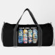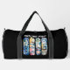 This black duffle bag features four vertical panels with vibrant watercolor nautical elements, including a fish on an anchor, a sailboat, a fish with a seashell, and a lighthouse with a dolphin, all under the text "SAILING VIBES." Edit color of the bag caps and body in the Design tool to your favored colors.